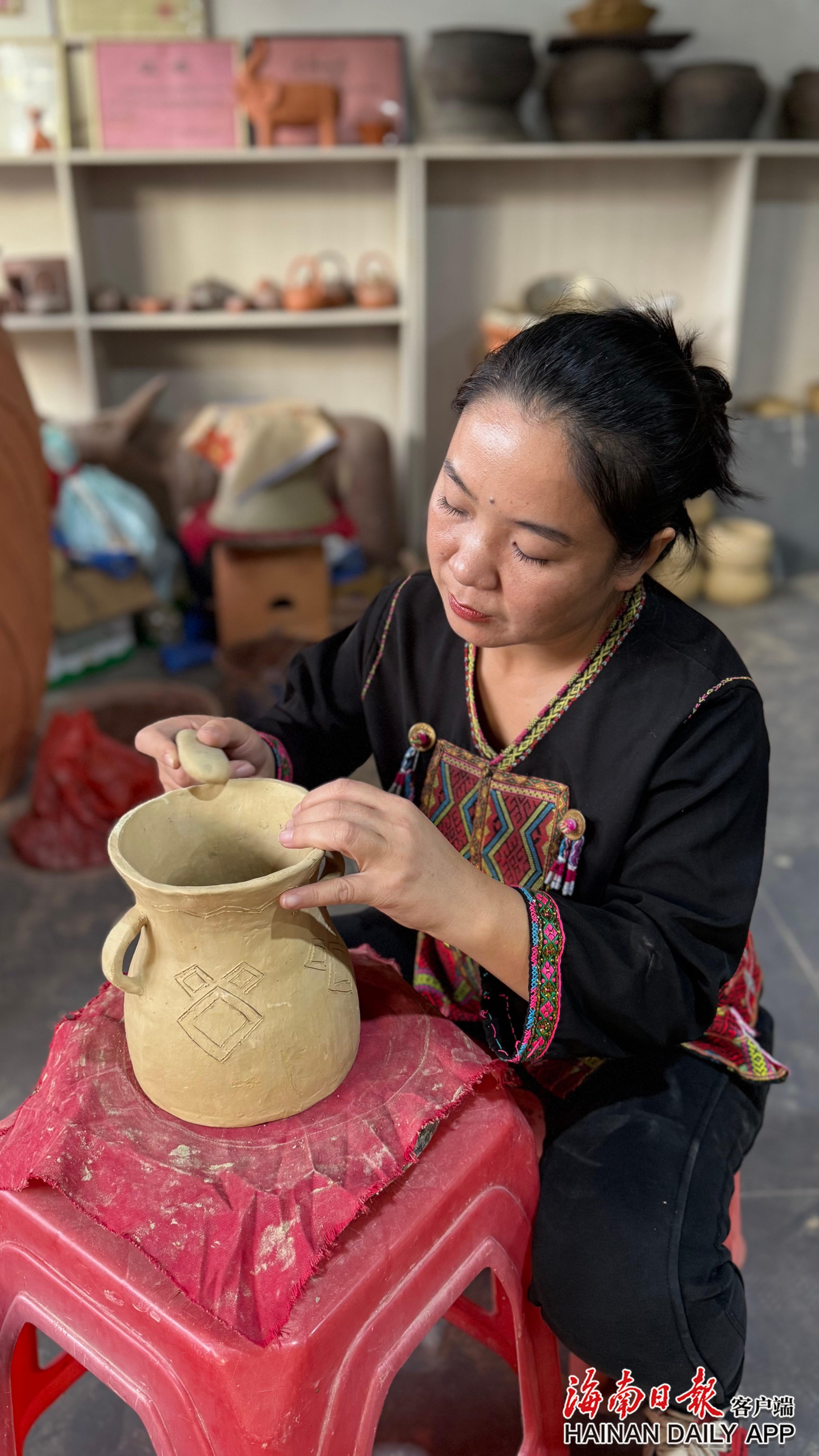 在母亲的带领下,刘桂凤与弟媳麦佳佳逐渐成为合作社的中坚力量,她们恪守传统技艺的同时,也尝试融入新意。“以前老一辈做的东西,注重使用功能,做好了能用就行,现在我们在追求外观的精美方面会花更多心思。”刘桂凤抓起身上穿的黎锦服饰一角举例,“像这种黎锦花纹也可以刻在陶器上,寓意长长久久。”
