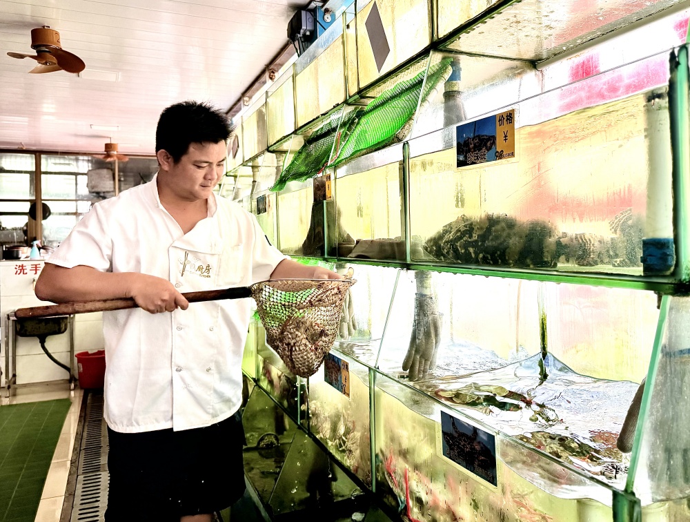 昌化镇大众海鲜大排档厨师为客户挑选海鲜